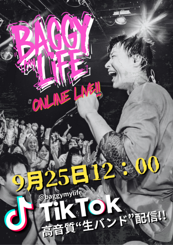 Baggy My Life初のオンラインライブ開催決定! 2025.09.19 LIVE ONLINE LIVE Vo.1 for TikTok 9月25日(木)、特別な配信ライブを開催いたします。 今回はこれまで以上に音質へこだわり、臨場感あふれるサウンドでお届けします。 会場にお越しいただけない方も、ご自宅から迫力ある演奏を存分にお楽しみください。 ◆開催日時:2025年9月3日(金)配信時間 12:00 / 終了時間 13:00 ◆LIVE配信先:https://www.tiktok.com/@baggymylife ◆出演アーティスト Baggy My Life