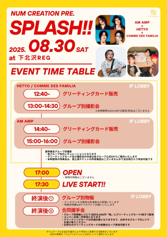 NUM CREATION pre. SPLASH!! NUM CREATION pre. SPLASH!! ◆開催日時:2025年8月30日(土)開場 17:00 / 開演17:30 ◆会場 :下北沢ReG 155-0032 東京都世田谷区代沢5丁目30−10 アール下北沢 2F 1階 地下1階~1階 ◆出演アーティスト Am Amp / hetyo / Comme des familia ◆販売URL: https://eplus.jp/numcreation-splash/ 料金:各チケット料金 + 1Drink 形式:スタンディング